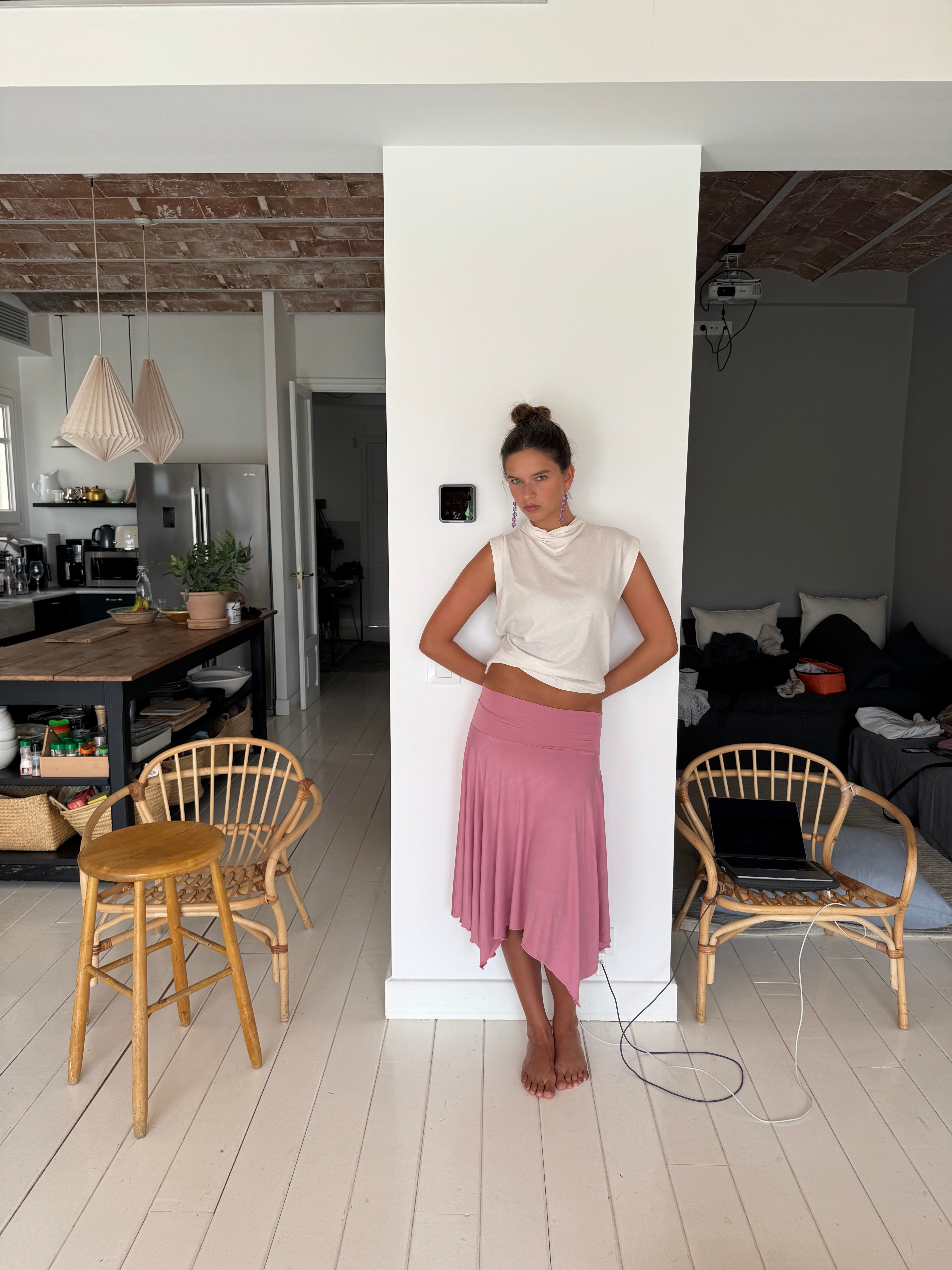 fit: mid-length skirt with elastic waistband, wavy hem and fluid drape. can be worn as a skirt or as a top.