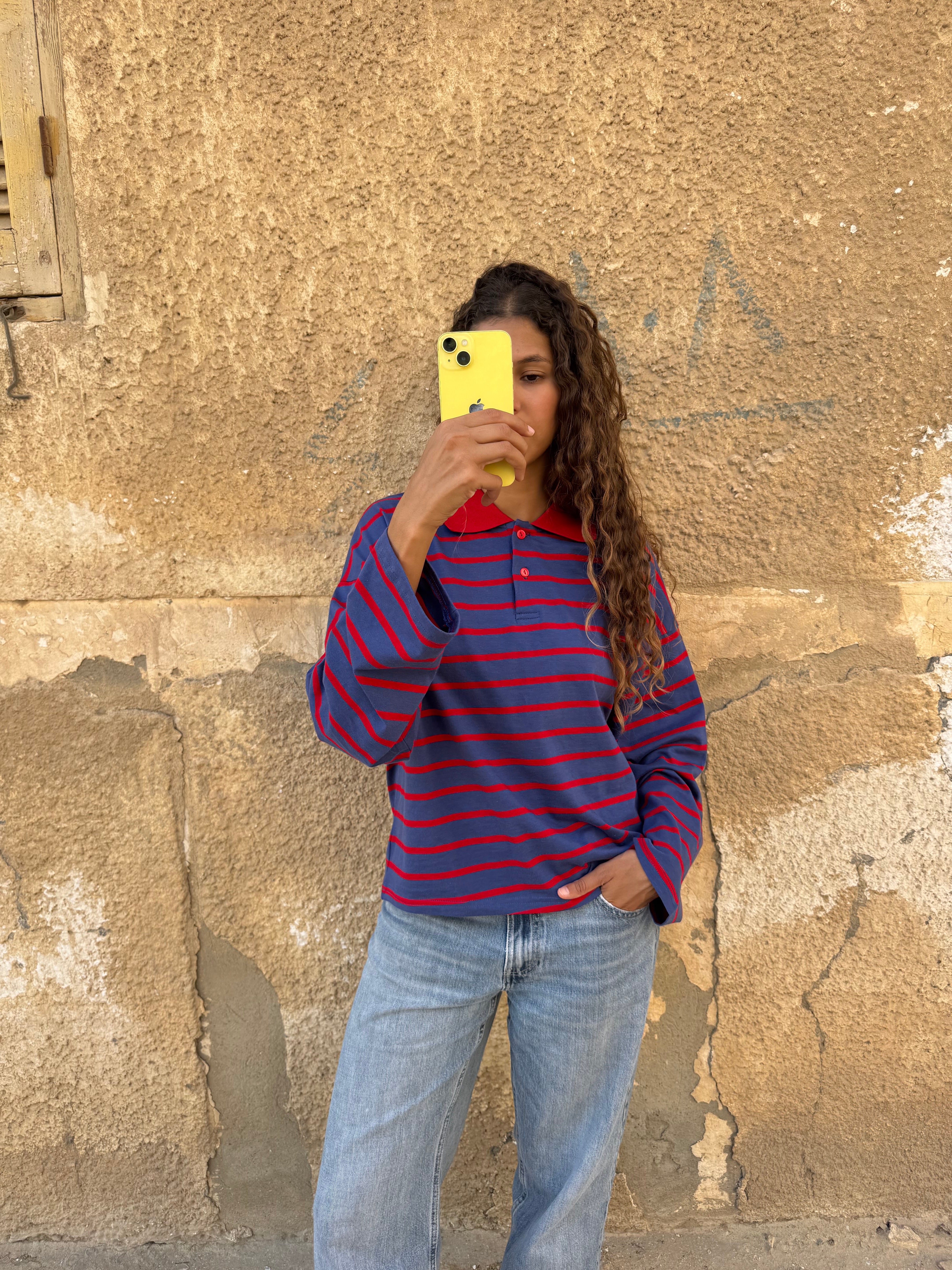 fit: long-sleeve polo made from soft cotton. features a white collar and front buttons. relaxed and comfortable fit.