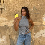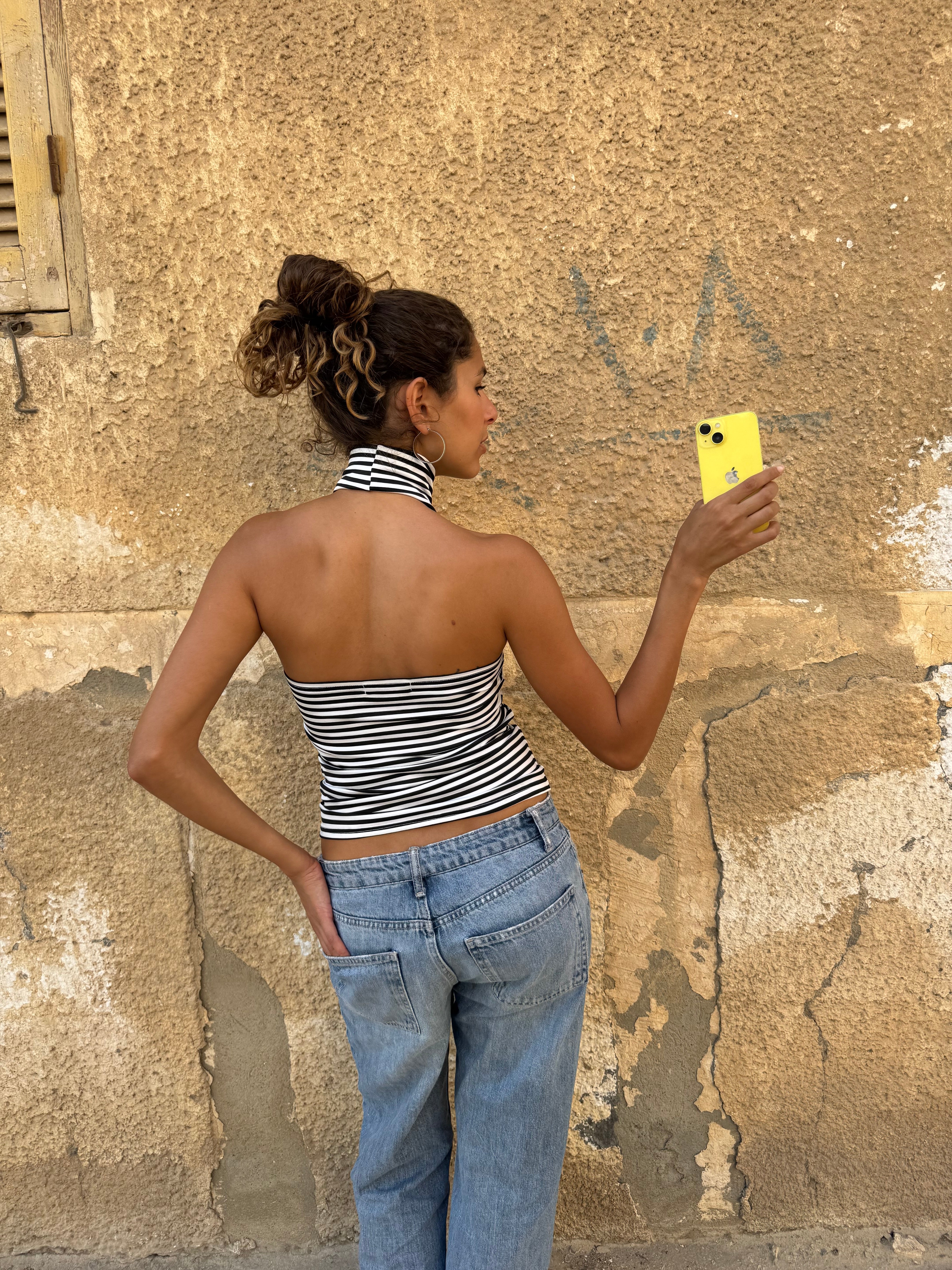 fit: backless top with a halter neckline. made from soft, stretchy fabric that fits close to the body.