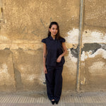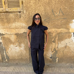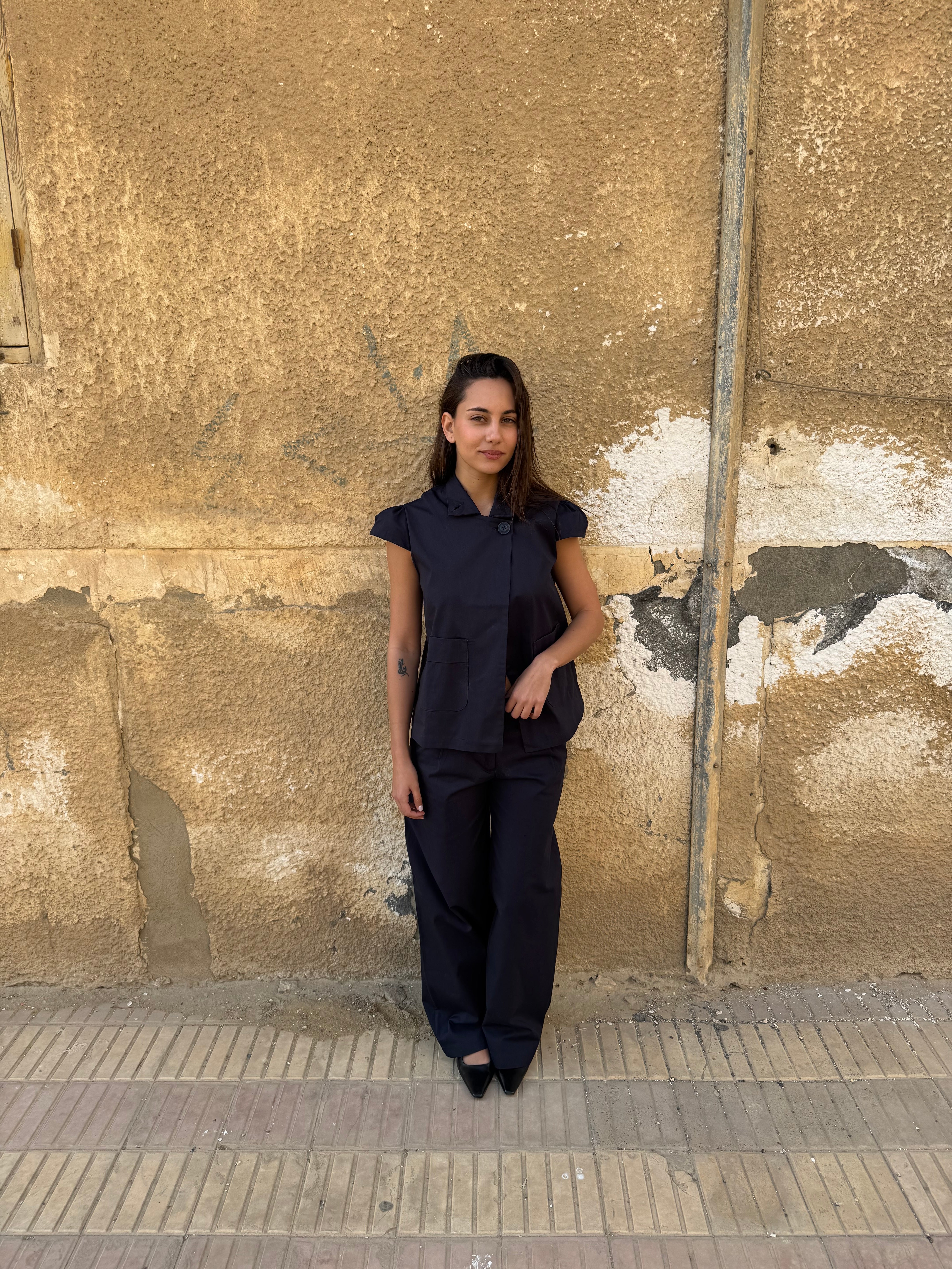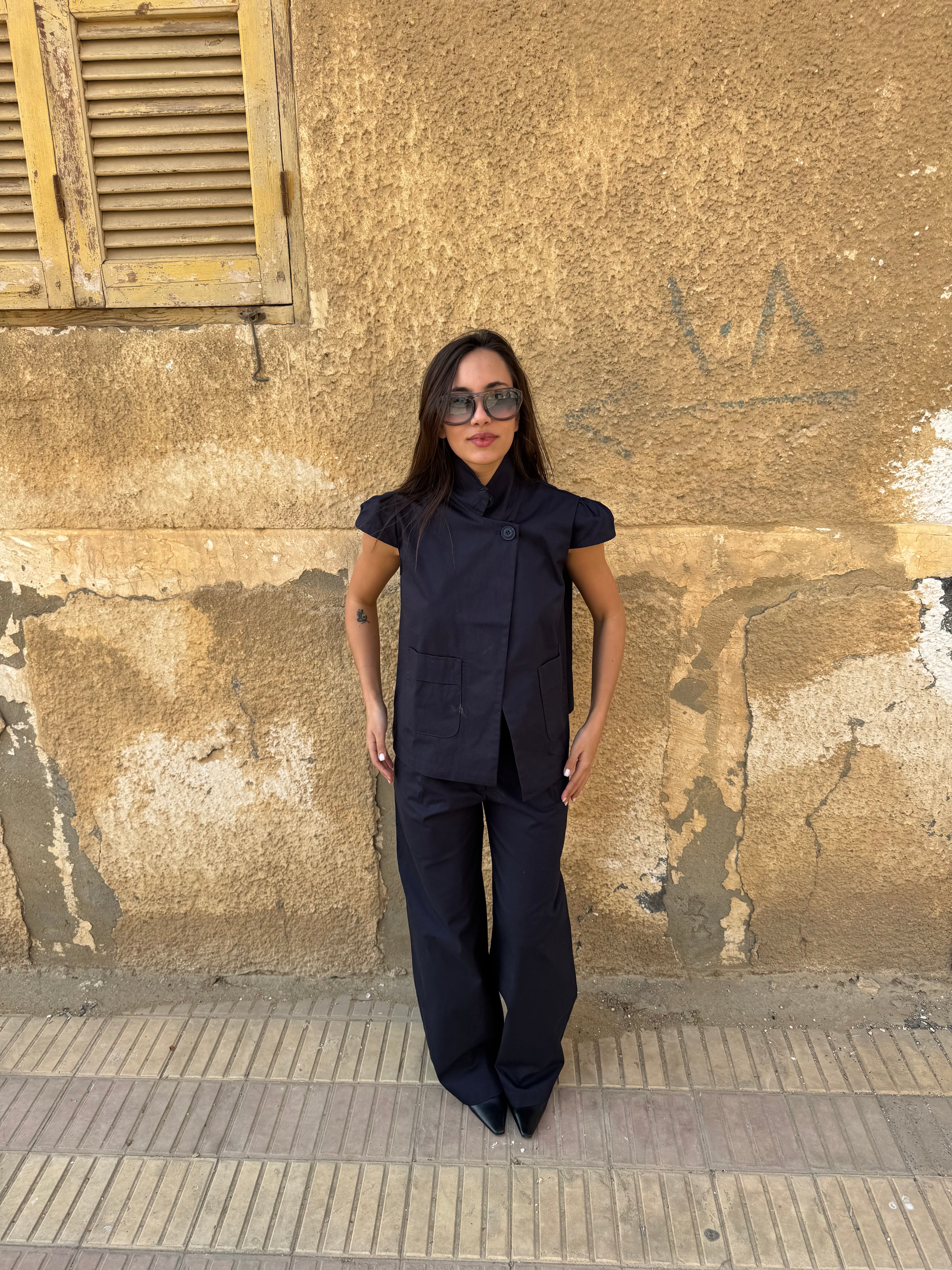 fit: short sleeve collar neck top with an asymmetric slit front and two large buttons. straight, slightly boxy fit that hits around the hip.